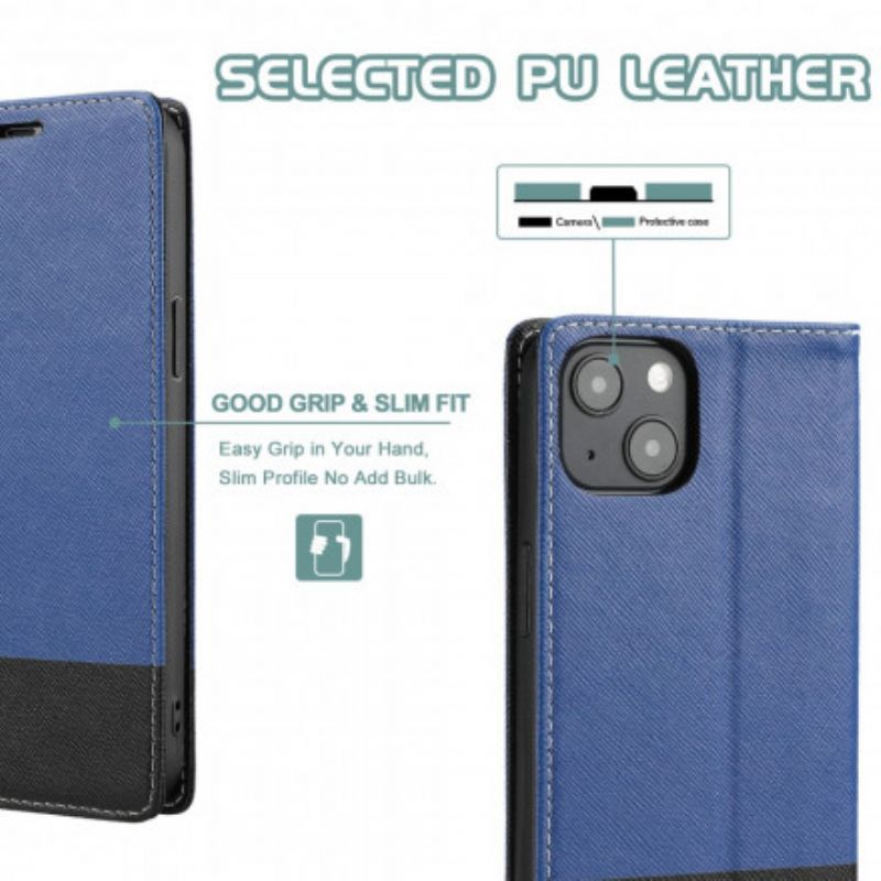 Strukturovaný dvoubarevný flipový kryt z umělé kůže je ideální pro ochranu vašeho iPhone 13 s prémiovým a barevným vzhledem.