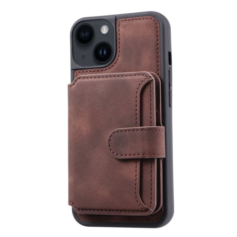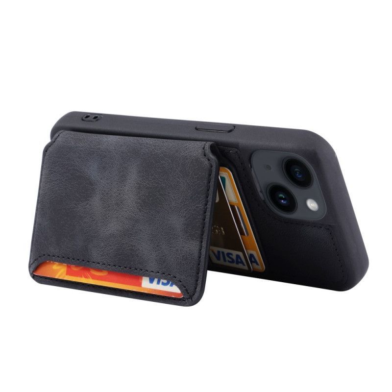 Zabezpečte Svůj Iphone 15 Plus Tímto Pouzdrem Z Imitace Kůže S Držákem Na Kartu, Který Slouží Jako Podpora.